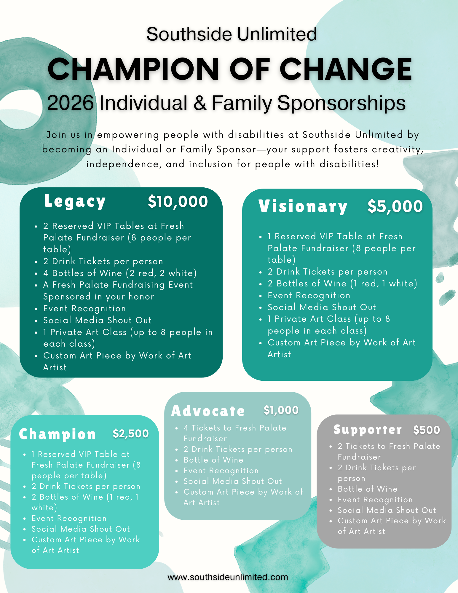 Become a "Champion of Change" by sponsoring Southside Unlimited, an organization dedicated to empowering adults with developmental disabilities. Your support enables us to blend artistic expression, personal progress, and active citizenship, fostering individual empowerment.
